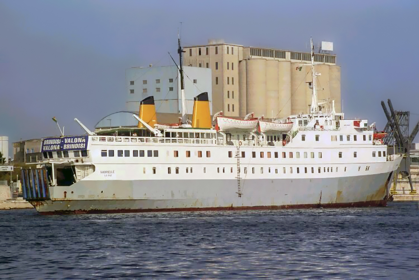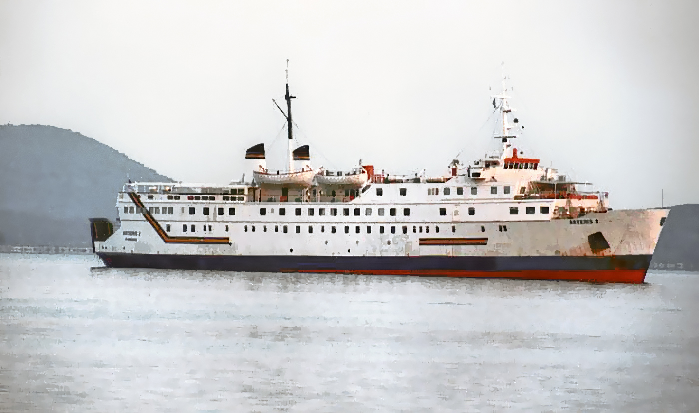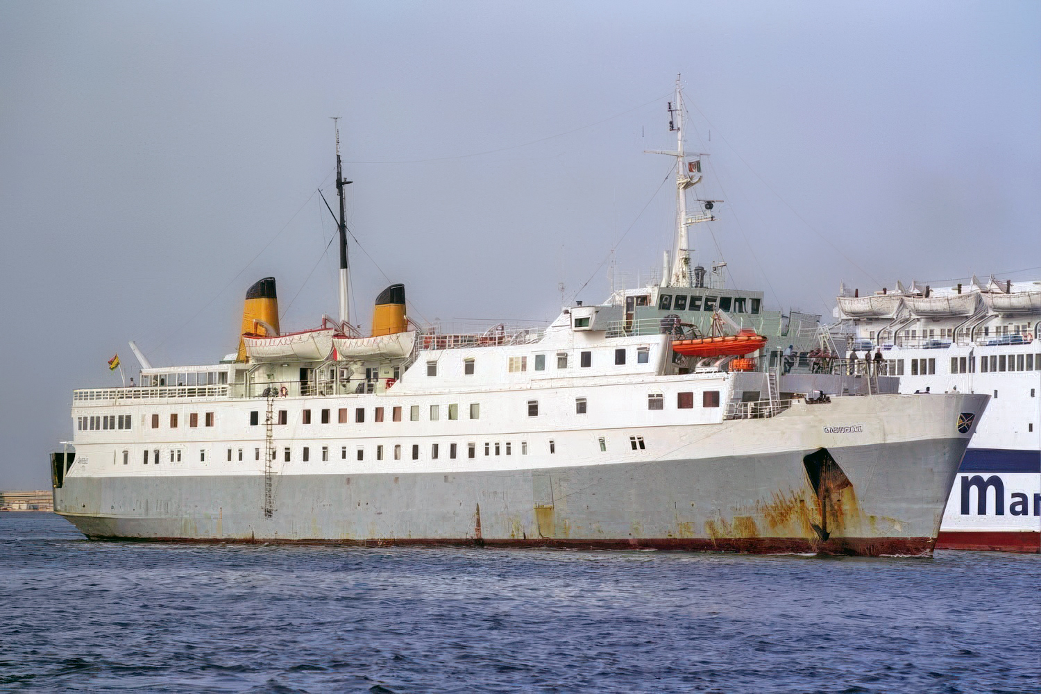 tyska flaggen uppe till höger i masten. Fönstren framtill övertäckta.